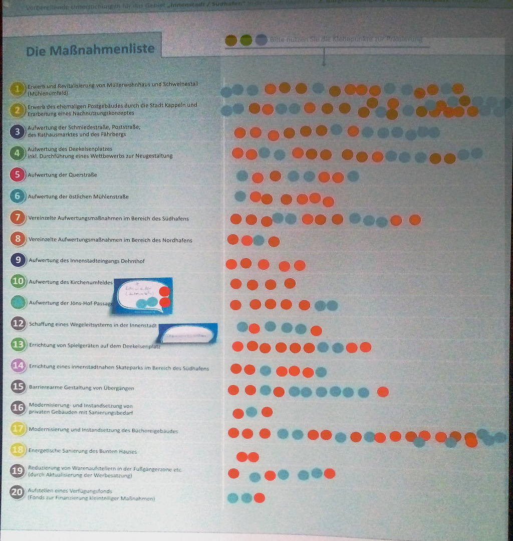 Im Rahmen der vorbereitenden Untersuchungen des Städtebauförderungsprogramms hatten die Bürger am gestern nochmal die Gelegenheit Prioritäten zu setzen, was ihnen in unserer Stadt besonders wichtig und Verbesserungswürdig ist. Auf einer Tafel konnten hinter den Maßnahmen Bewertungspunkte gesetzt werden.